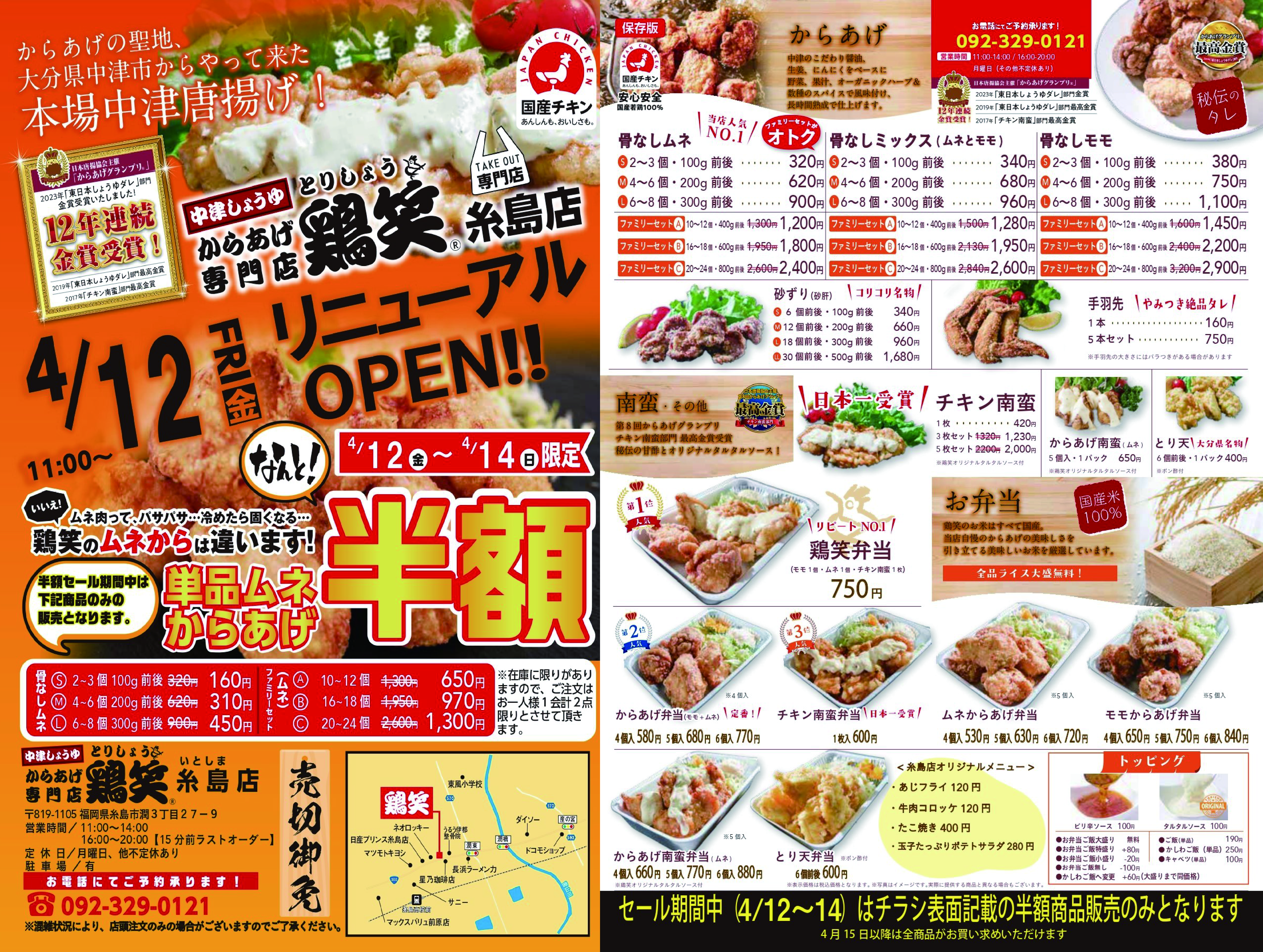 4月12日 鶏笑 糸島店(福岡県) オープン!